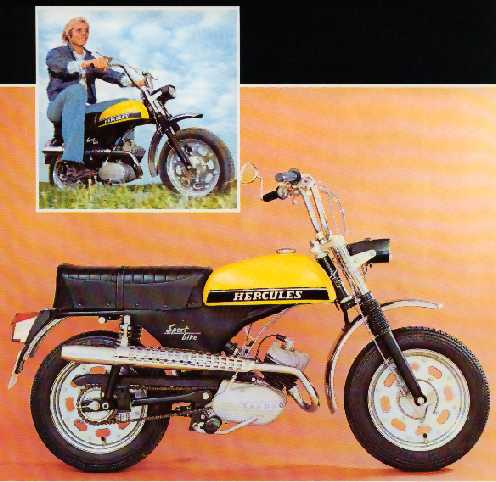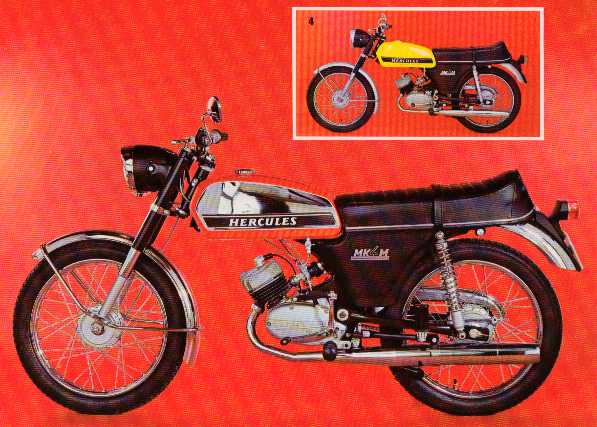 Mokick MK 4 M Das Mokick im Motorrad-Look, eine wunderschöne Maschine. Das Styling eine Wucht - Motorradrahmen in mattschwarz, Chromtank mit goldorange abgesetzt, Teleskopgabel, Hinterradschwinge mit offenen Federbeinen, Chrombleche, verchr. Kettenschutz, große elegante Doppelsitzbank, 130mm Scheinwerfer. SACHS - Vollbremsnaben 115 mm (Hinterrad mit Steckachse) Bereifung: 21/4 - 17. Der SACHS - Motor hat ein fußgeschaltetes 4 - Gang - Getriebe und Kickstarter, Leistung 2,9 PS. Ab 16 Jahren können auch Sie mit Führerschein 5 auf der Hercules MK 4 M starten.