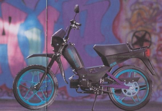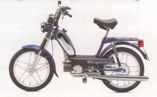 MOTOR: 50 ccm Hubraum, 25 km/h Höchstgeschwindigkeit. GETRIEBE: 2-Gang-Fußschaltung, Kickstarter. FEDERUNG: Verstärkte Teleskopgabel vorne mit 85 mm Federweg, hinten Schwinge mit gedämpftem Zentralfederbein, Federweg 60 mm. BREMSEN: Trommelbremsen vorne und hinten, Rücktrittbremse. TANKVOLUMEN: 4,8 Liter. AUSSTATTUNG: Sport-Sitzbank, Breitstrahl-Scheinwerfer, Gepäckträger. FARBEN: Schwarzmetallic. SONDERZUBEHÖR: ausführliche Beschreibung siehe Seite 14/15.