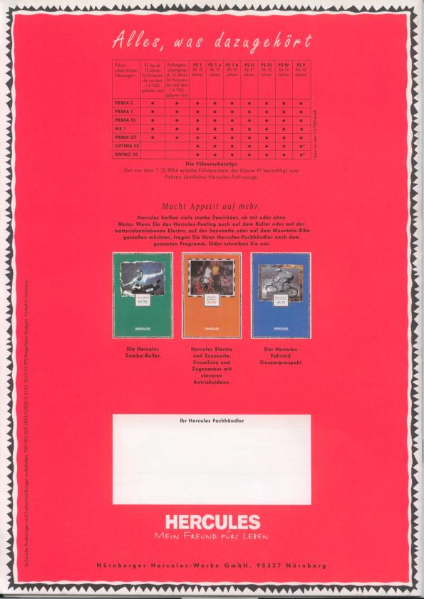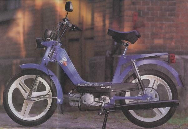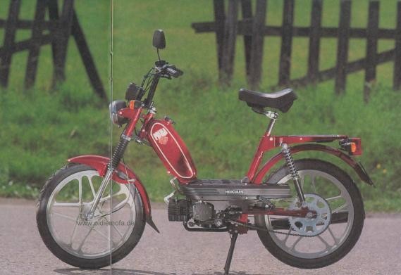 MOTOR: 50 ccm Hubraum, 25 km/h Höchstgeschwindigkeit. GETRIEBE: 2-Gang-Handschaltung. FEDERUNG: Vorne Teleskopgabel mit 80 mm Federweg, hinten Schwinge mit geschlossenen Federbeinen, Federweg 50 mm. BREMSEN: Trommelbremsen vorne und hinten, Rücktrittbremse. TANKVOLUMEN: 4,5 Liter. AUSSTATTUNG: Breitstrahl-Scheinwerfer. Gepäckträger mit Federklappe. FARBEN: Schwarzmetallic, Orientrot, Petrol. SONDERZUBEHÖR: ausführliche Beschreibung siehe Seite 14/15.